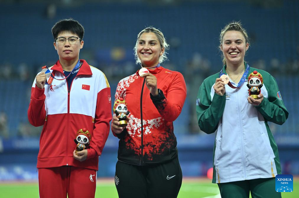Silver medalist Su Lingdan (L) of China, gold medalist Eda Tugsuz (C) of Türkiye and bronze medalist Jana Van Schalkwyk of South Africa pose for photos during the awarding ceremony for athletics women's javelin throw at the 31st FISU Summer World University Games in Chengdu, southwest China's Sichuan Province, Aug. 3, 2023. (Xinhua/Cai Xiangxin)