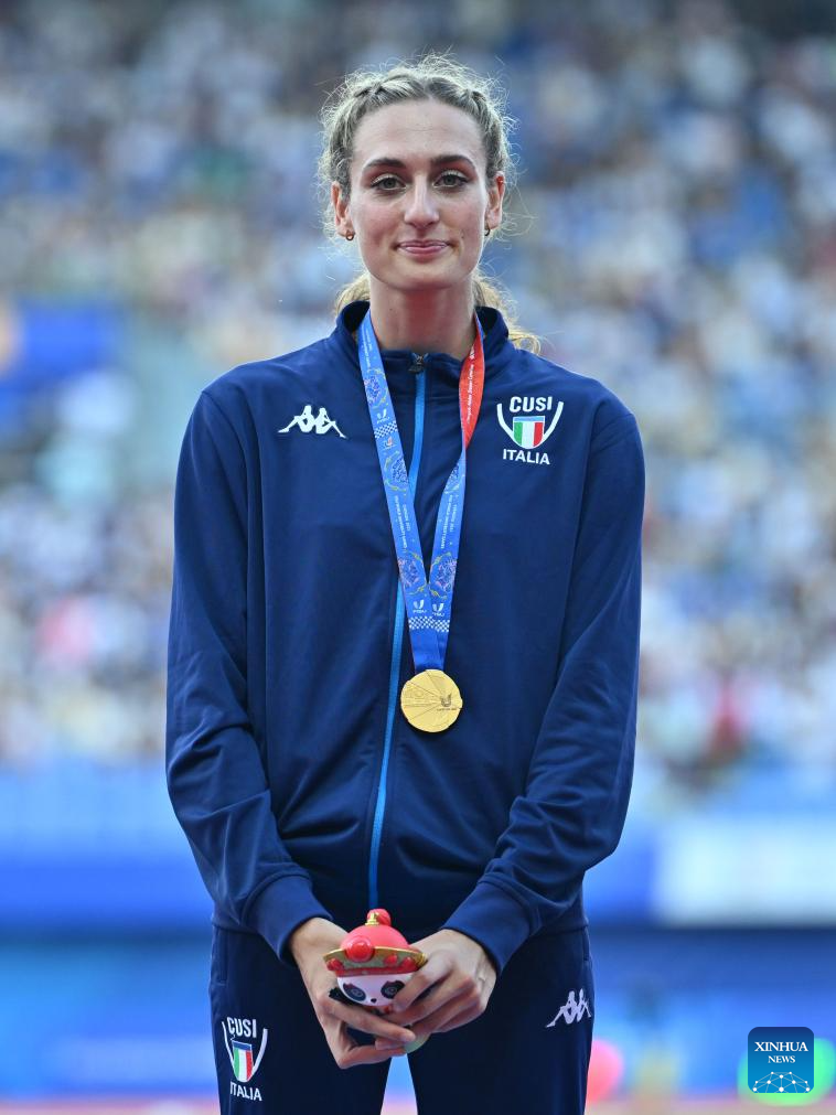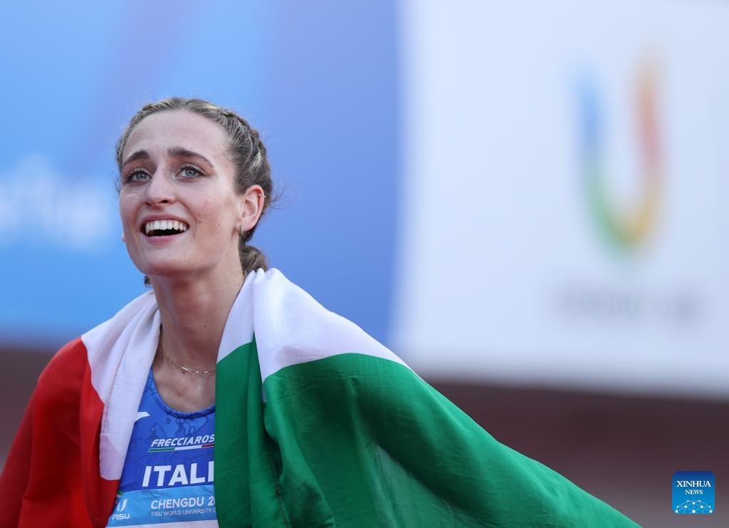 Gold medalist Laura Pellicoro of Italy poses for photos during the awarding ceremony for the athletics women's 800m at the 31st FISU Summer World University Games in Chengdu, southwest China's Sichuan Province, Aug. 3, 2023. (Xinhua/Cai Xiangxin)