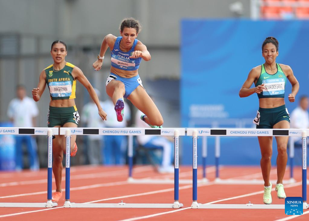Alice Muraro (top) of Italy competes during the athletics women's 400m hurdles final at the 31st FISU Summer World University Games in Chengdu, southwest China's Sichuan Province, Aug. 3, 2023. (Xinhua/Jia Haocheng)