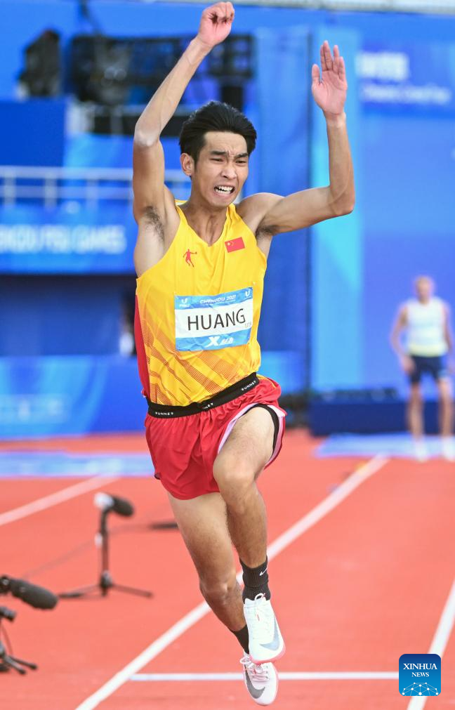 Huang Huafeng of China competes during the athletics men's triple jump final at the 31st FISU Summer World University Games in Chengdu, southwest China's Sichuan Province, Aug. 3, 2023. (Xinhua/Deng Hua)