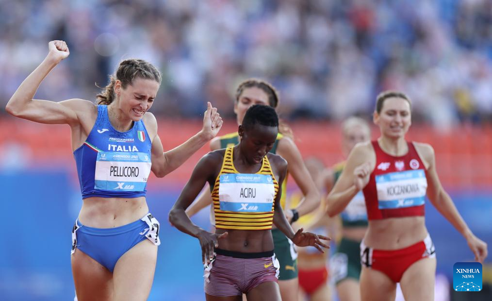 Laura Pellicoro of Italy reacts after the athletics women's 800m final at the 31st FISU Summer World University Games in Chengdu, southwest China's Sichuan Province, Aug. 3, 2023. (Xinhua/Jia Haocheng)