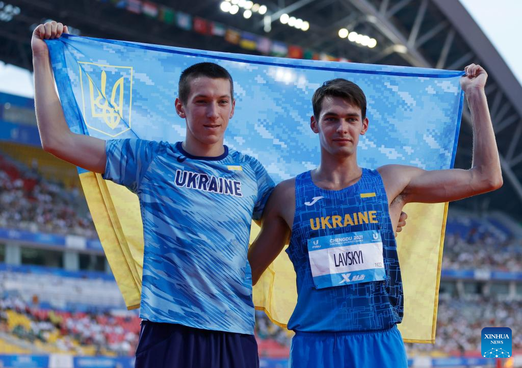 Gold medalist Vladyslav Lavskyi (R) of Ukraine celebrates with teammate bronze medalist Roman Petruk after the athletics men's high jump final at the 31st FISU Summer World University Games in Chengdu, southwest China's Sichuan Province, Aug. 3, 2023. (Xinhua/Jia Haocheng)