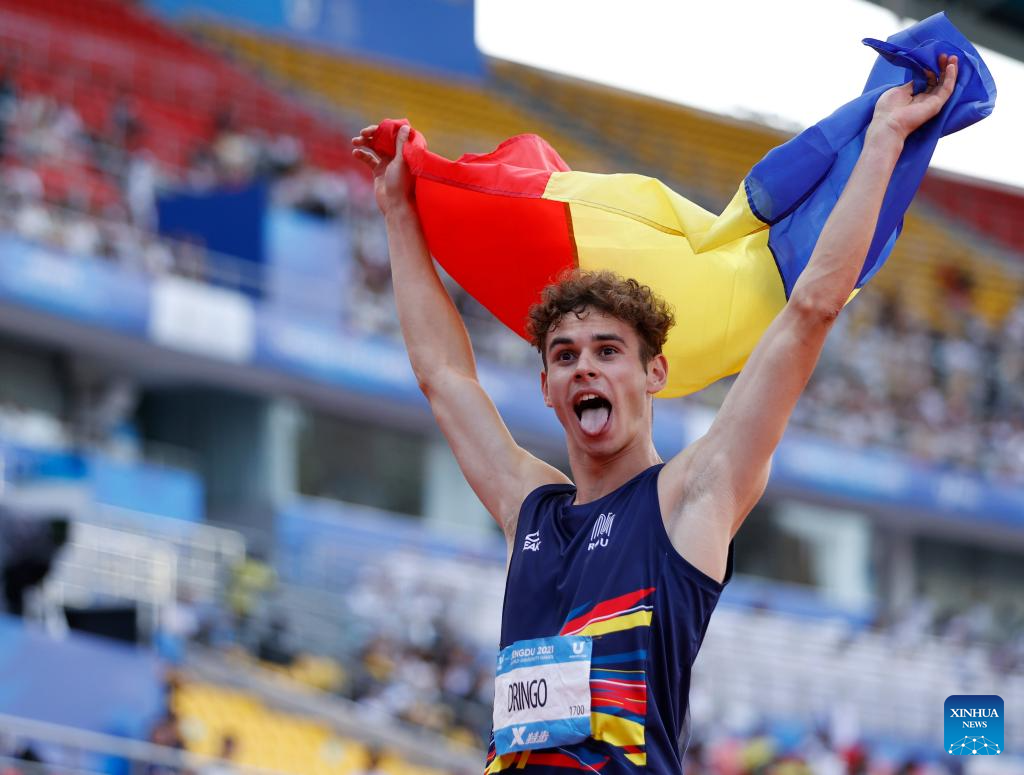 Bronze medalist Mihai-Sorin Dringo of Romania celebrates after the athletics men's 400m final at the 31st FISU Summer World University Games in Chengdu, southwest China's Sichuan Province, Aug. 3, 2023. (Xinhua/Jia Haocheng)
