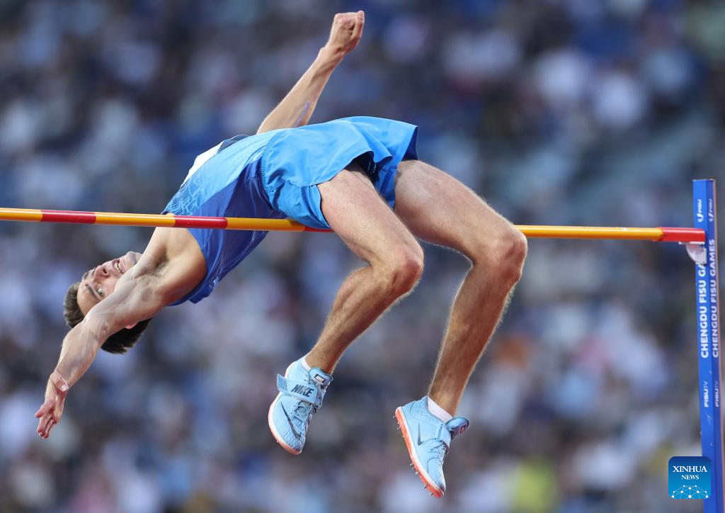 Vladyslav Lavskyi of Ukraine competes during the athletics men's high jump final at the 31st FISU Summer World University Games in Chengdu, southwest China's Sichuan Province, Aug. 3, 2023. (Xinhua/Jia Haocheng)