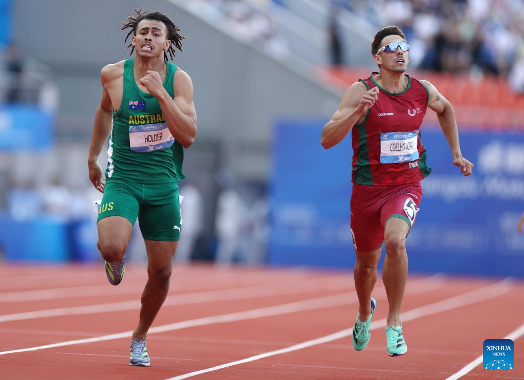 Joao Ricardo Agostinho Coelho (R) of Portugal and Reece Nathaniel Holder of Australia race during the athletics men's 400m final at the 31st FISU Summer World University Games in Chengdu, southwest China's Sichuan Province, Aug. 3, 2023. (Xinhua/Jia Haocheng)