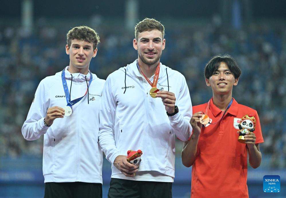 Gold medalist Jens Christian Mergenthaler (C) of Germany, silver medalist Nick Jager (L) of Germany and bronze medalist Shobu Atsushi of Japan pose during the awarding ceremony for athletics men's 3000m steeplechase at the 31st FISU Summer World University Games in Chengdu, southwest China's Sichuan Province, Aug. 3, 2023. (Xinhua/Cai Xiangxin)