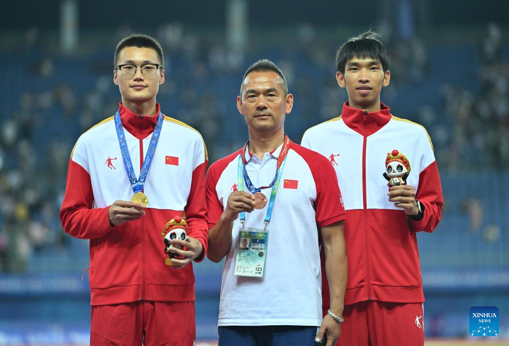 Gold medalist Su Wen (L) of China and bronze medalist Huang Huafeng (R) of China pose with coach Yu Changqing for photos during the awarding ceremony for the athletics men's triple jump final at the 31st FISU Summer World University Games in Chengdu, southwest China's Sichuan Province, Aug. 3, 2023. (Xinhua/Cai Xiangxin)