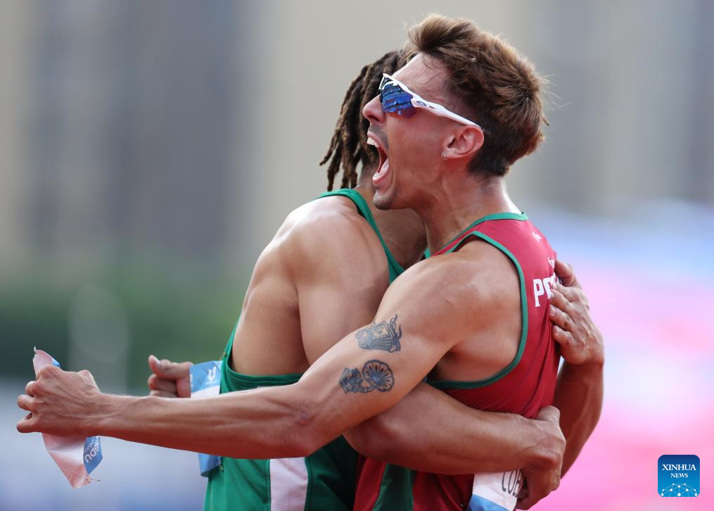Gold medalist Joao Ricardo Agostinho Coelho (R) of Portugal and silver medalist Reece Nathaniel Holder of Australia hug each other after the athletics men's 400m final at the 31st FISU Summer World University Games in Chengdu, southwest China's Sichuan Province, Aug. 3, 2023. (Xinhua/Jia Haocheng)