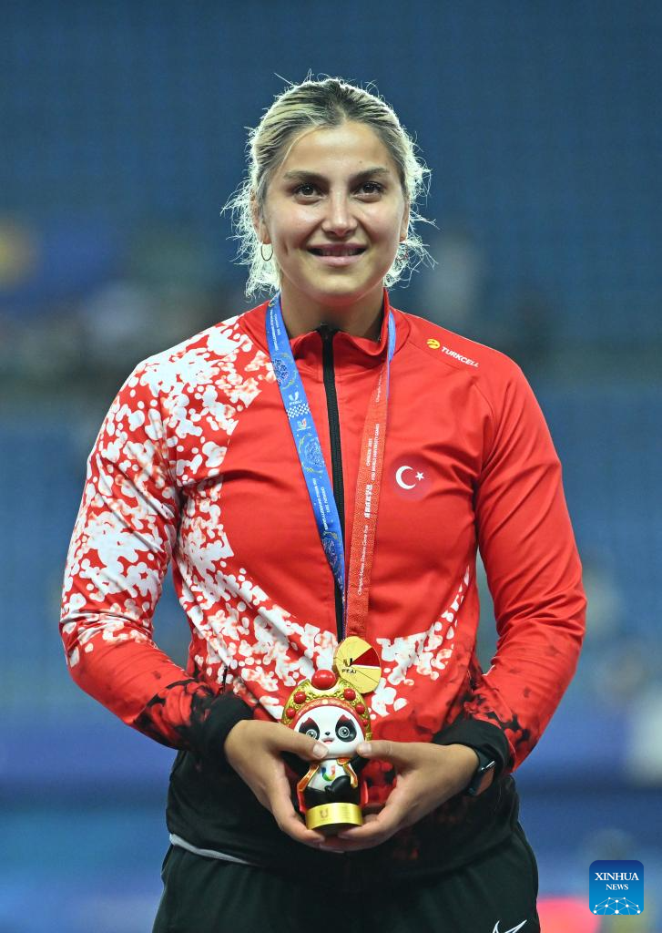 Gold medalist Eda Tugsuz of Türkiye poses for photos during the awarding ceremony for athletics women's javelin throw at the 31st FISU Summer World University Games in Chengdu, southwest China's Sichuan Province, Aug. 3, 2023. (Xinhua/Cai Xiangxin)