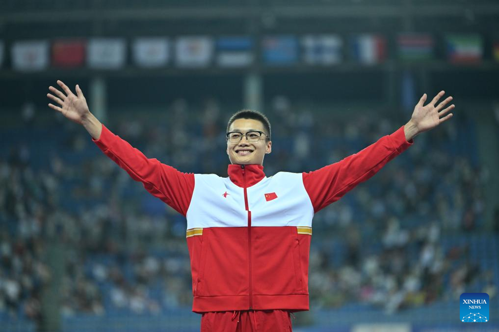 Gold medalist Su Wen of China celebrates during the awarding ceremony for the athletics men's triple jump final at the 31st FISU Summer World University Games in Chengdu, southwest China's Sichuan Province, Aug. 3, 2023. (Xinhua/Cai Xiangxin)