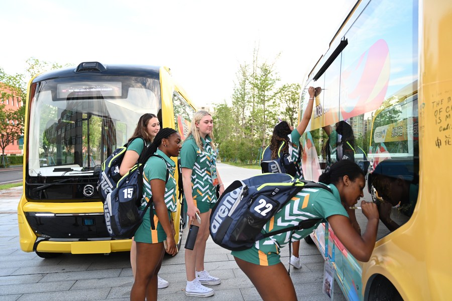 This photo taken on Aug. 2, 2023 shows student-athletes from South Africa signing on the self-driving bus in the Village of the 31st FISU Summer World University Games in Chengdu, capital city of southwest China's Sichuan Province.(Xinhua/Hua Hongli)