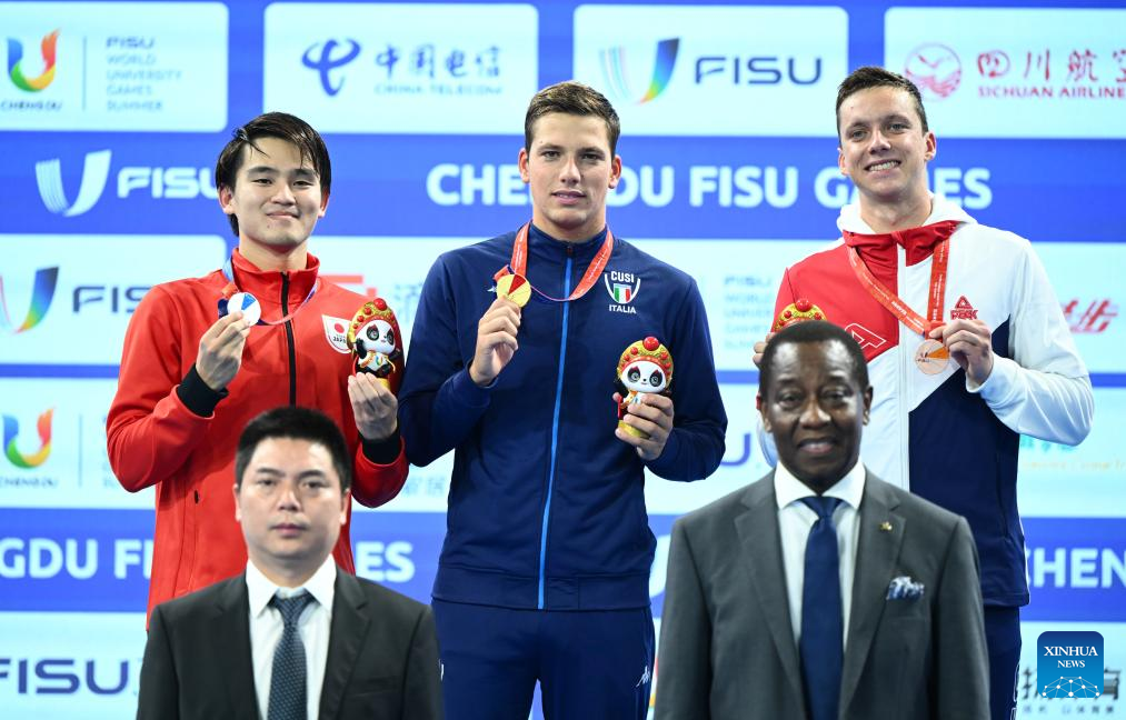 Gold medalist Ivan Giovannoni (C) of Italy, silver medalist Tabuchi Kaito (top L) of Japan and bronze medalist Christopher Nagy (top R) of the United States pose on the podium during the awarding ceremony for men's 1500m freestyle of swimming at the 31st FISU Summer World University Games in Chengdu, southwest China's Sichuan Province, Aug. 3, 2023. (Xinhua/Wu Gang)