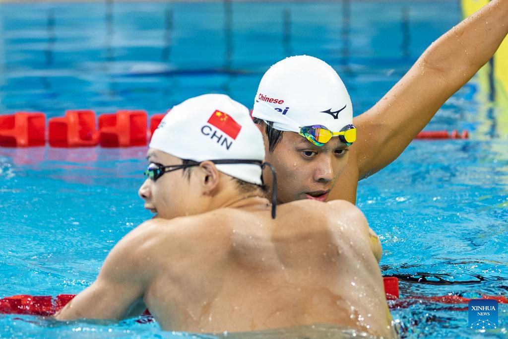 Huang Zhiwei (L) of China hugs Wang Hsing-hao of Chinese Taipei after the men's 200m individual medley final of swimming at the 31st FISU Summer World University Games in Chengdu, southwest China's Sichuan Province, Aug. 3, 2023. (Xinhua/Huang Wei)