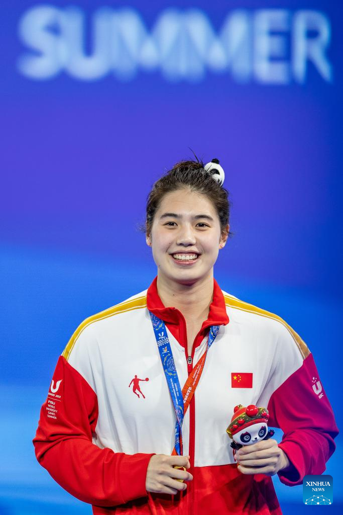 Zhang Yufei of China poses during the awarding ceremony for the Women's 100m Freestyle of swimming at the 31st FISU Summer World University Games in Chengdu, southwest China's Sichuan Province, Aug. 3, 2023. (Xinhua/Huang Wei)