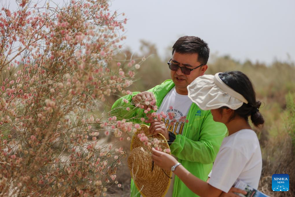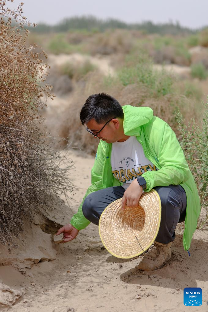 This photo taken on June 12, 2023 shows Merdan Keyum checking the growth of camel thorn at the natural experimental fields of the Qira station under the Xinjiang Institute of Ecology and Geography of the Chinese Academy of Sciences (CAS) in northwest China's Xinjiang Uygur Autonomous Region. Merdan Keyum was born in 1987 in what is today Gaochang District of the city of Turpan. Located only dozens of kilometers from the Kumtag Desert, the city is frequently plagued by sandstorms that often cause power outages and halt farmwork in springtime.