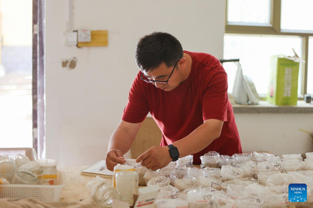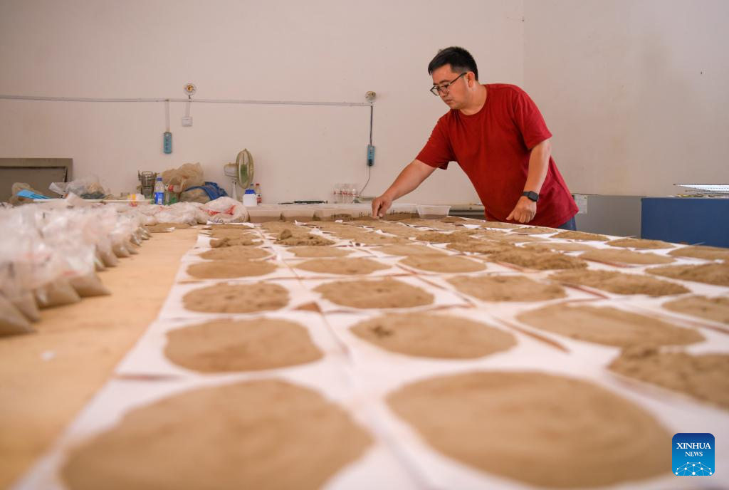 This photo taken on June 13, 2023 shows Merdan Keyum checking and analyzing soil samples at the Qira station under the Xinjiang Institute of Ecology and Geography of the Chinese Academy of Sciences (CAS) in northwest China's Xinjiang Uygur Autonomous Region. Merdan Keyum was born in 1987 in what is today Gaochang District of the city of Turpan. Located only dozens of kilometers from the Kumtag Desert, the city is frequently plagued by sandstorms that often cause power outages and halt farmwork in springtime.