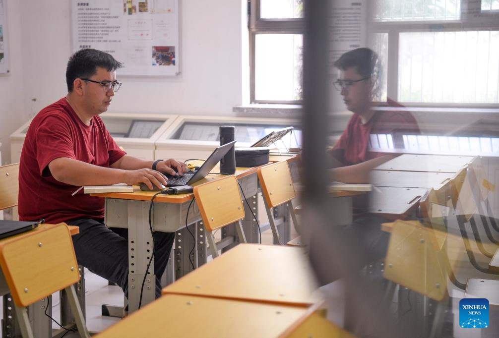 This photo taken on June 13, 2023 shows Merdan Keyum analyzing data at the Qira station under the Xinjiang Institute of Ecology and Geography of the Chinese Academy of Sciences (CAS) in northwest China's Xinjiang Uygur Autonomous Region. Merdan Keyum was born in 1987 in what is today Gaochang District of the city of Turpan. Located only dozens of kilometers from the Kumtag Desert, the city is frequently plagued by sandstorms that often cause power outages and halt farmwork in springtime.
