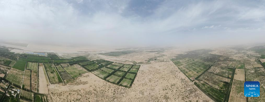 This aerial panoramic photo taken on June 12, 2023 shows the natural experimental fields of the Qira station under the Xinjiang Institute of Ecology and Geography of the Chinese Academy of Sciences (CAS) in northwest China's Xinjiang Uygur Autonomous Region. Merdan Keyum was born in 1987 in what is today Gaochang District of the city of Turpan. Located only dozens of kilometers from the Kumtag Desert, the city is frequently plagued by sandstorms that often cause power outages and halt farmwork in springtime.