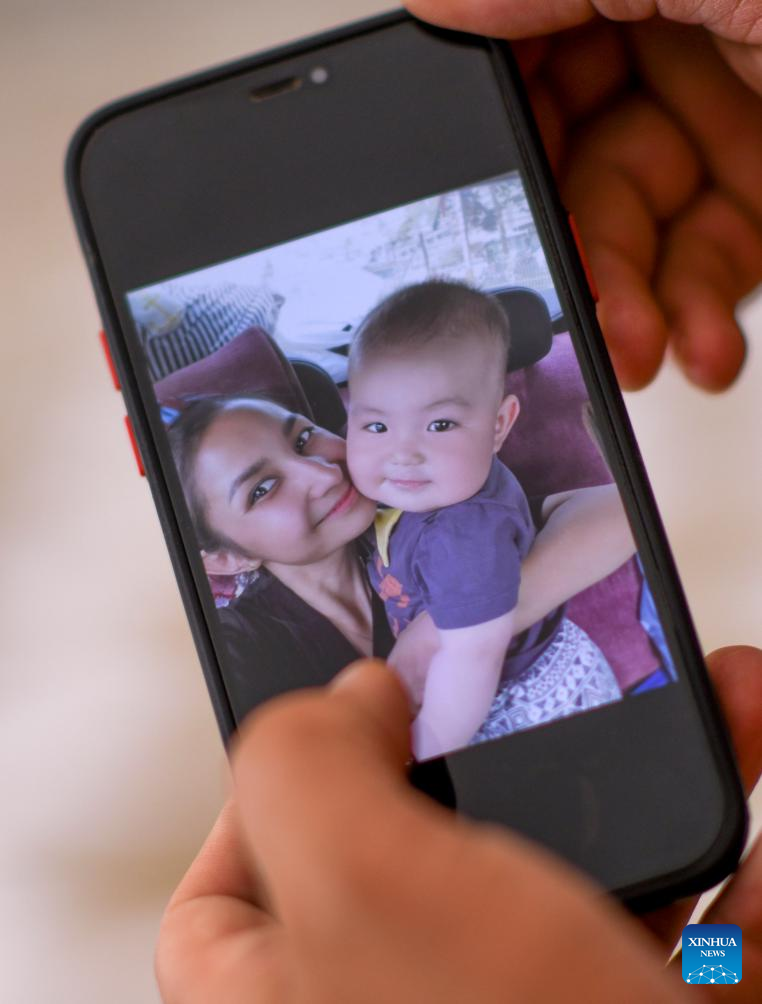 This photo taken on June 13, 2023 shows Merdan Keyum watching a photo of his wife and child at the Qira station under the Xinjiang Institute of Ecology and Geography of the Chinese Academy of Sciences (CAS) in northwest China's Xinjiang Uygur Autonomous Region. Merdan Keyum was born in 1987 in what is today Gaochang District of the city of Turpan. Located only dozens of kilometers from the Kumtag Desert, the city is frequently plagued by sandstorms that often cause power outages and halt farmwork in springtime.