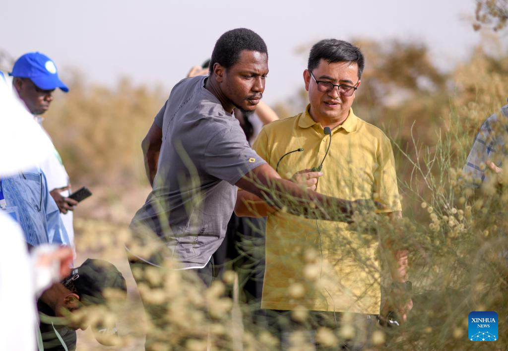 This photo taken on June 13, 2023 shows Merdan Keyum (1st R) answering questions from an African apprentice at the natural experimental fields of the Qira station under the Xinjiang Institute of Ecology and Geography of the Chinese Academy of Sciences (CAS) in northwest China's Xinjiang Uygur Autonomous Region. Merdan Keyum was born in 1987 in what is today Gaochang District of the city of Turpan. Located only dozens of kilometers from the Kumtag Desert, the city is frequently plagued by sandstorms that often cause power outages and halt farmwork in springtime.