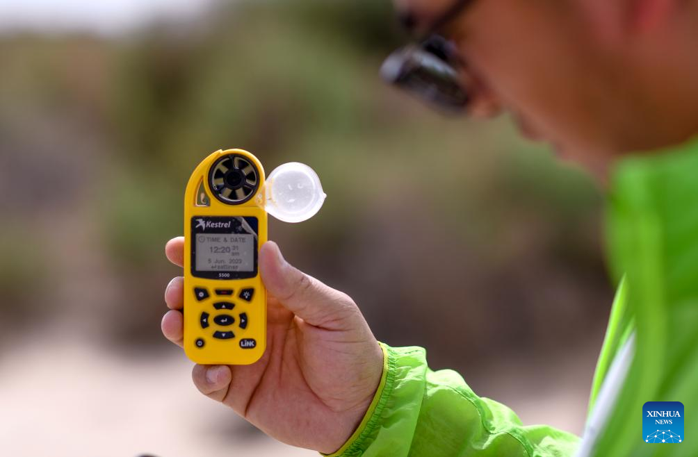 This photo taken on June 12, 2023 shows Merdan Keyum checking a wind speed measuring device at the natural experimental fields of the Qira station under the Xinjiang Institute of Ecology and Geography of the Chinese Academy of Sciences (CAS) in northwest China's Xinjiang Uygur Autonomous Region. Merdan Keyum was born in 1987 in what is today Gaochang District of the city of Turpan. Located only dozens of kilometers from the Kumtag Desert, the city is frequently plagued by sandstorms that often cause power outages and halt farmwork in springtime.