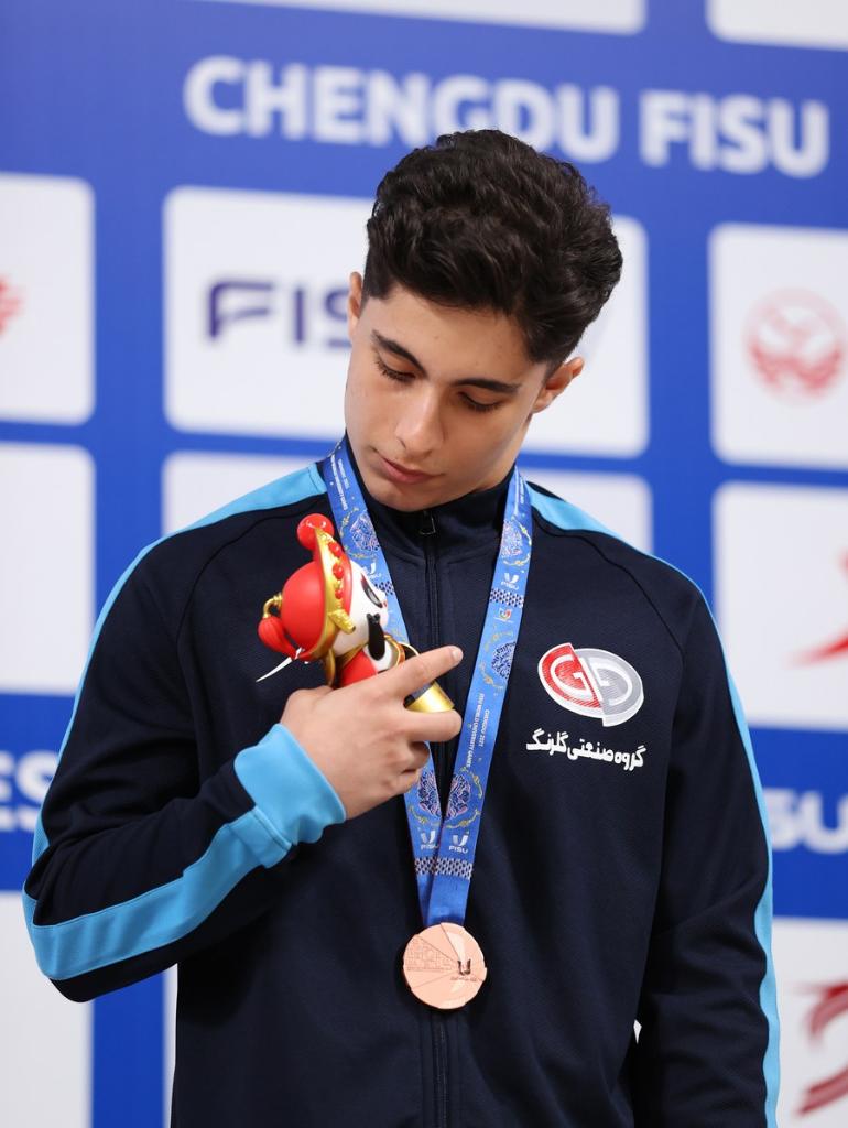 Shahin Banitalebi of Iran inspects his Rongbao mascot during the medal ceremony for the Wushu Men's Nanquan, July 29, 2023. (Xinhua/Jia Haocheng)