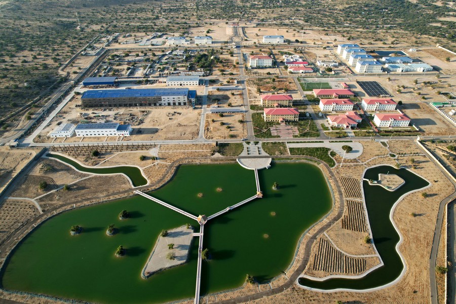 This aerial photo taken on Feb. 28, 2023 shows the view of dormitories besides a man-made lake at the Thar Coal Block-I Coal Electricity Integration project in Sindh province, an energy cooperation project under the framework of the China-Pakistan Economic Corridor (CPEC). (Thar Coal Block-I Power Generation Company (Pvt) Limited/Handout via Xinhua)
