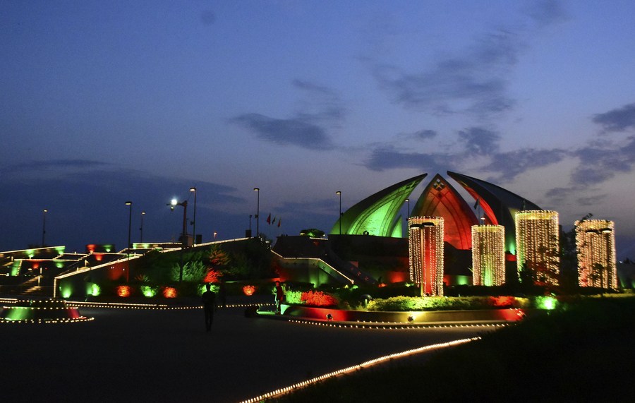 This photo taken on July 29, 2023 shows the Pakistan Monument with a special illumination to celebrate the 10th anniversary of the launch of the China-Pakistan Economic Corridor (CPEC) in Islamabad, capital of Pakistan. (Str/Xinhua)