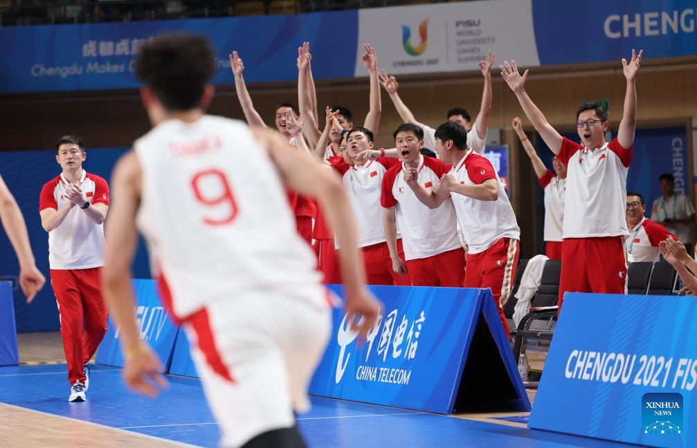 Team China celebrate during the Men's Basketball 9th-12th Place match at the 31st FISU Summer World University Games in Chengdu, southwest China's Sichuan Province, Aug. 4, 2023. (Xinhua/Yang Qing)