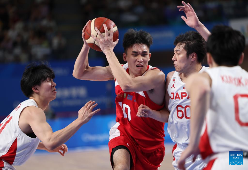 Xie Zhijie (2nd L) of China vies with Makanae Yuto (3rd L) of Japan during the Men's Basketball 9th-12th Place match at the 31st FISU Summer World University Games in Chengdu, southwest China's Sichuan Province, Aug. 4, 2023. (Xinhua/Yang Qing)