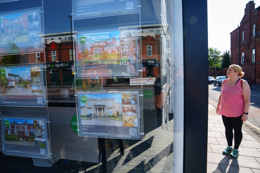 A woman stands by an estate agent in Manchester, Britain, June 22, 2023. (Photo by Jon Super/Xinhua)