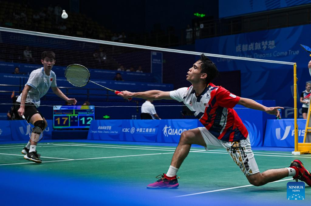 Faiz Rozain (R) of Malaysia competes during the Men's Singles round of 32 match of badminton against Dong Tianyao of China at the 31st FISU Summer World University Games in Chengdu, southwest China's Sichuan Province, Aug. 4, 2023. (Xinhua/Jigme Dorje)