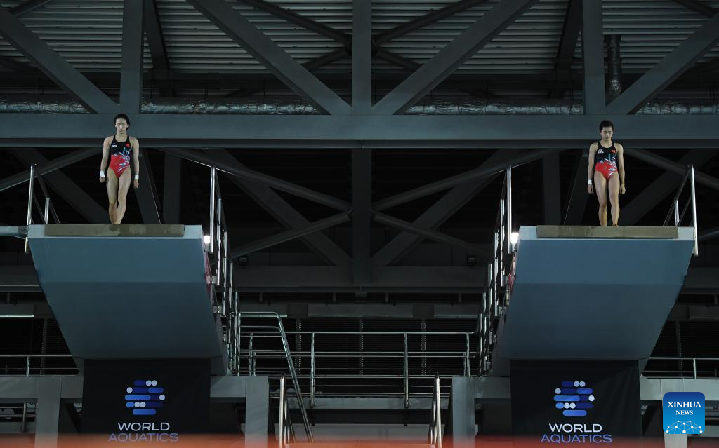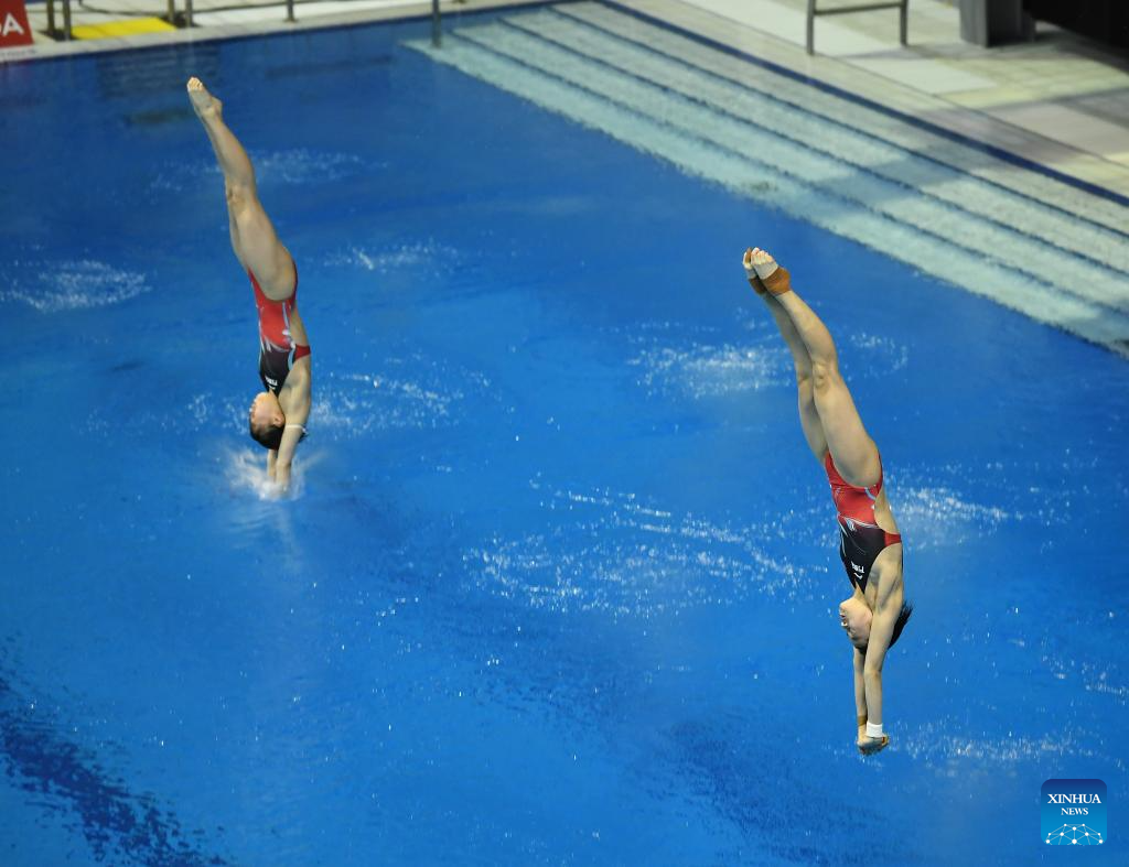 Chen Yuxi (L)/Quan Hongchan of China compete during the women's synchronized 10m platform final at the World Aquatics Diving World Cup 2023 Super Final in Berlin, Germany, Aug. 4, 2023. (Xinhua/Ren Pengfei)