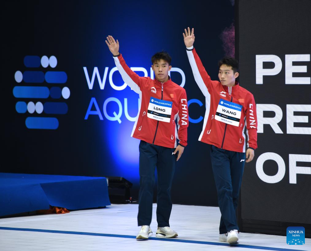 Long Daoyi/Wang Zongyuan (R) of China wave to the spectators before the men's synchronized 3m springboard event at the World Aquatics Diving World Cup 2023 Super Final in Berlin, Germany, Aug. 4, 2023. (Xinhua/Ren Pengfei)