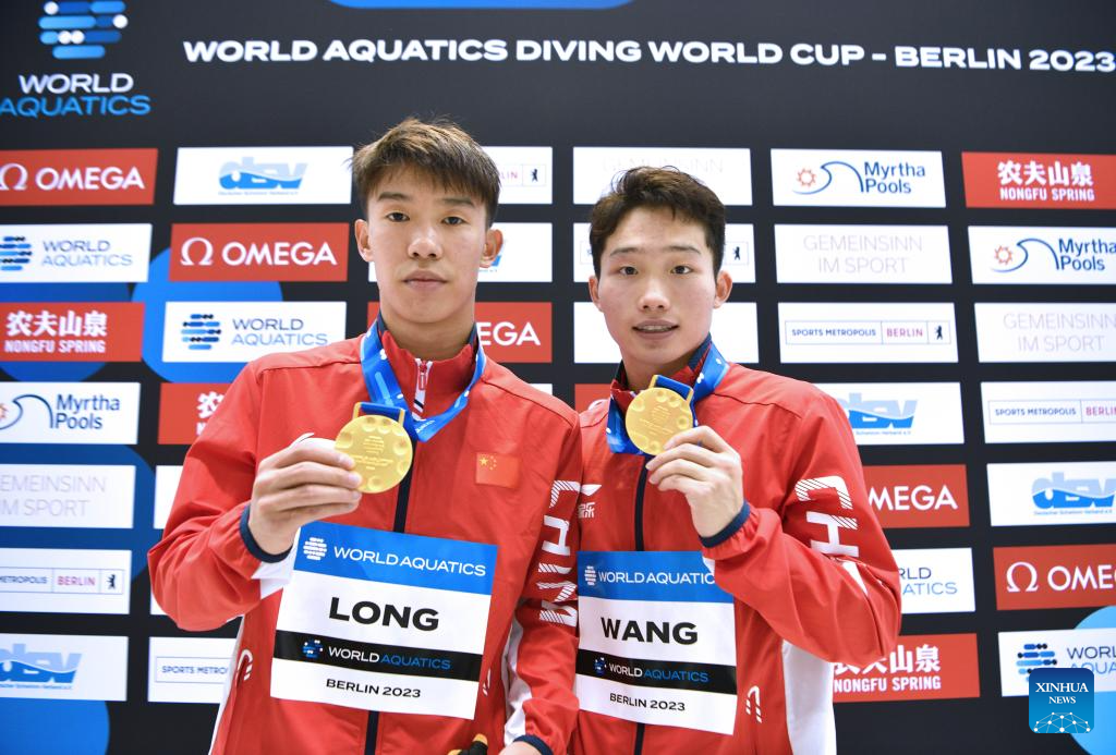 Long Daoyi/Wang Zongyuan (R) of China pose for photos after the awarding ceremony of the men's synchronized 3m springboard event at the World Aquatics Diving World Cup 2023 Super Final in Berlin, Germany, Aug. 4, 2023. (Xinhua/Ren Pengfei)