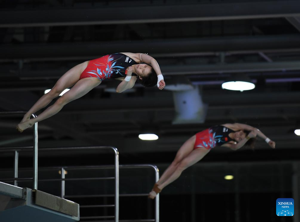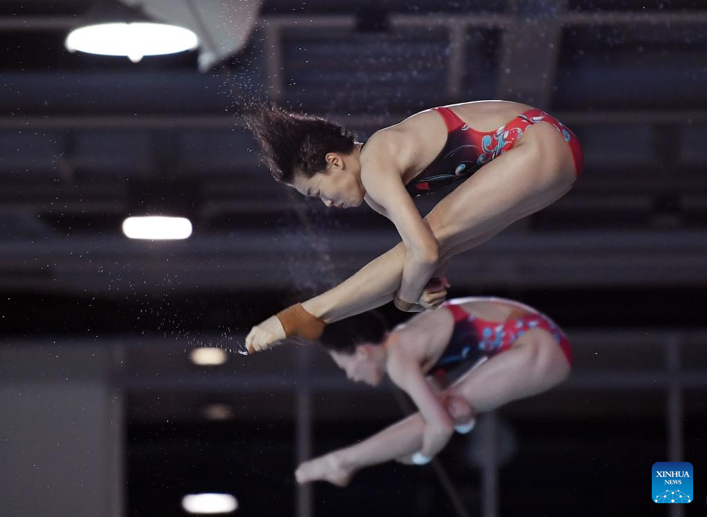 Chen Yuxi/Quan Hongchan (top) of China compete during the women's synchronized 10m platform final at the World Aquatics Diving World Cup 2023 Super Final in Berlin, Germany, Aug. 4, 2023. (Xinhua/Ren Pengfei)