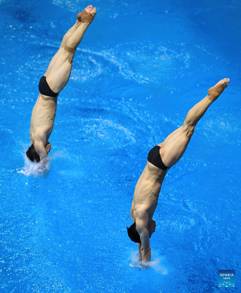 Long Daoyi/Wang Zongyuan (top) of China compete during the men's synchronized 3m springboard event at the World Aquatics Diving World Cup 2023 Super Final in Berlin, Germany, Aug. 4, 2023. (Xinhua/Ren Pengfei)
