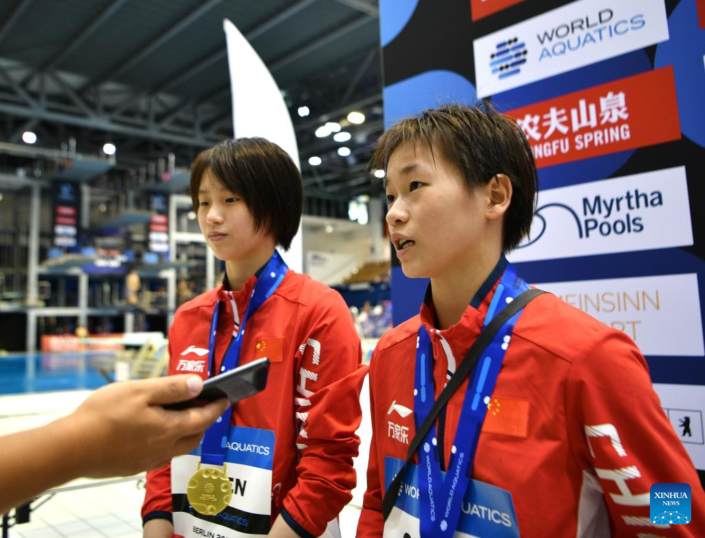 Chen Yuxi/Quan Hongchan (R) of China are interviewed after the awarding ceremony of the women's synchronized 10m platform event at the World Aquatics Diving World Cup 2023 Super Final in Berlin, Germany, Aug. 4, 2023. (Xinhua/Ren Pengfei)