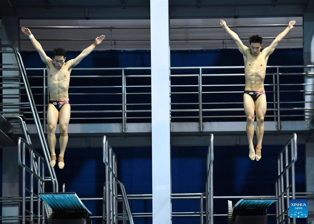 Long Daoyi/Wang Zongyuan (L) of China compete during the men's synchronized 3m springboard event at the World Aquatics Diving World Cup 2023 Super Final in Berlin, Germany, Aug. 4, 2023. (Xinhua/Ren Pengfei)