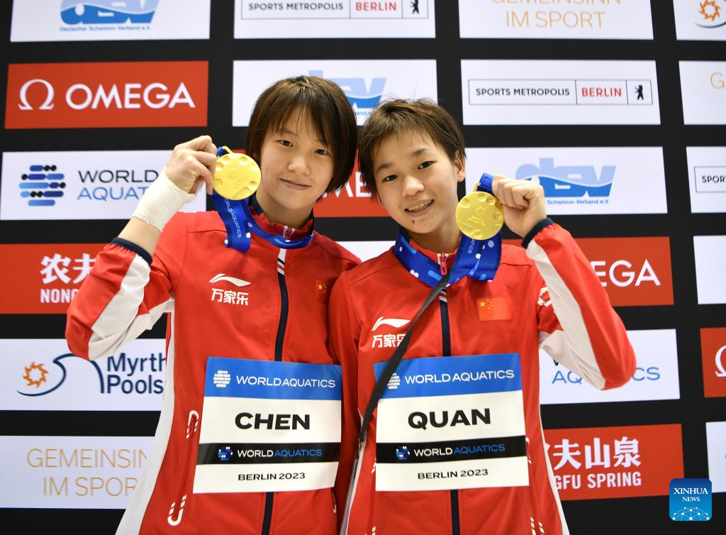 Chen Yuxi/Quan Hongchan (R) of China pose for photos after the awarding ceremony of the women's synchronized 10m platform event at the World Aquatics Diving World Cup 2023 Super Final in Berlin, Germany, Aug. 4, 2023. (Xinhua/Ren Pengfei)
