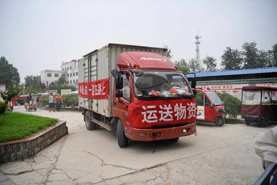 Rescuers deliver life supplies to flood-hit residents in Shawo Village, Matou Town of Zhuozhou, north China's Hebei Province, Aug. 3, 2023. (Xinhua/Mu Yu)