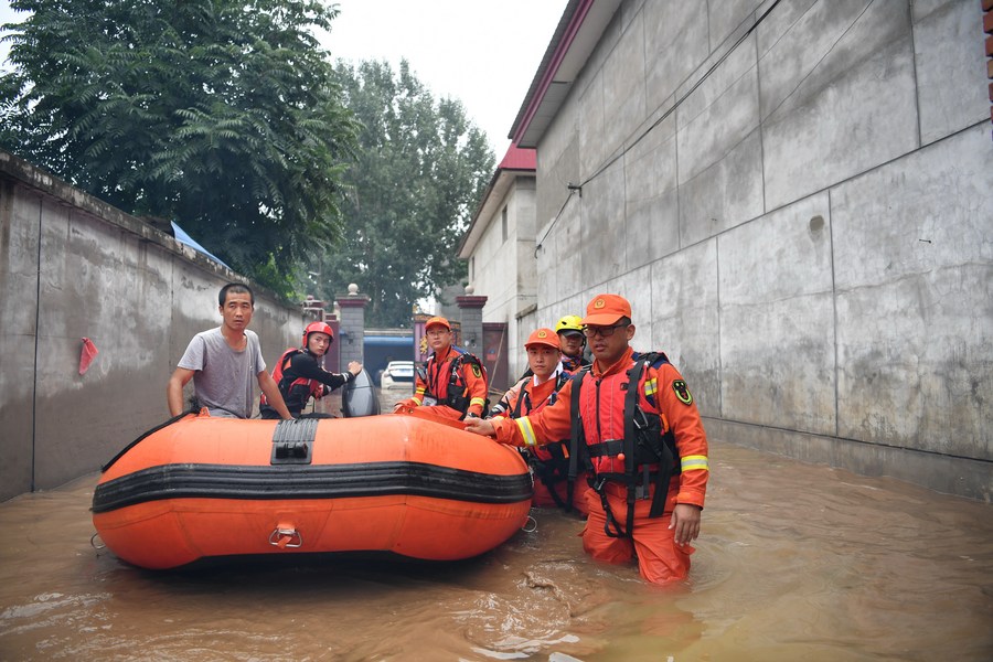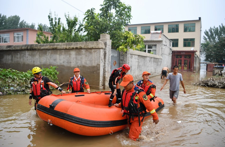 Rescuers carry out rescue operation in Shawo Village, Matou Town of Zhuozhou, north China's Hebei Province, Aug. 3, 2023. (Xinhua/Mu Yu)