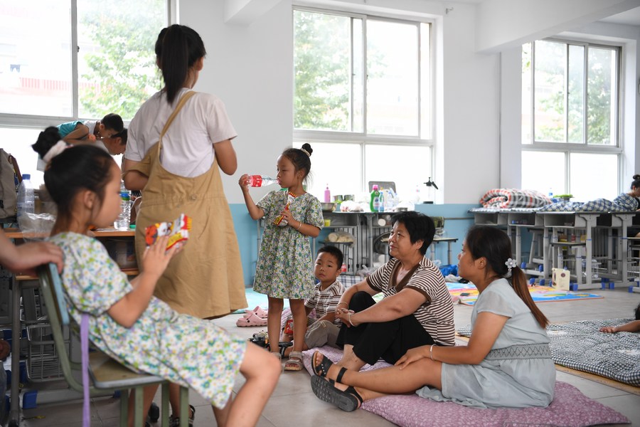 People rest at a settlement site inside a middle school in Zhuozhou, north China's Hebei Province, Aug. 3, 2023. (Xinhua/Mu Yu)