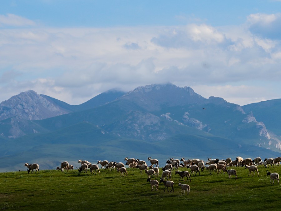 This photo taken on July 6, 2023 shows a flock of sheep on the grassland in Tianjun County of Haixi Mongolian and Tibetan Autonomous Prefecture, northwest China's Qinghai Province. (Xinhua/Zhang Long)