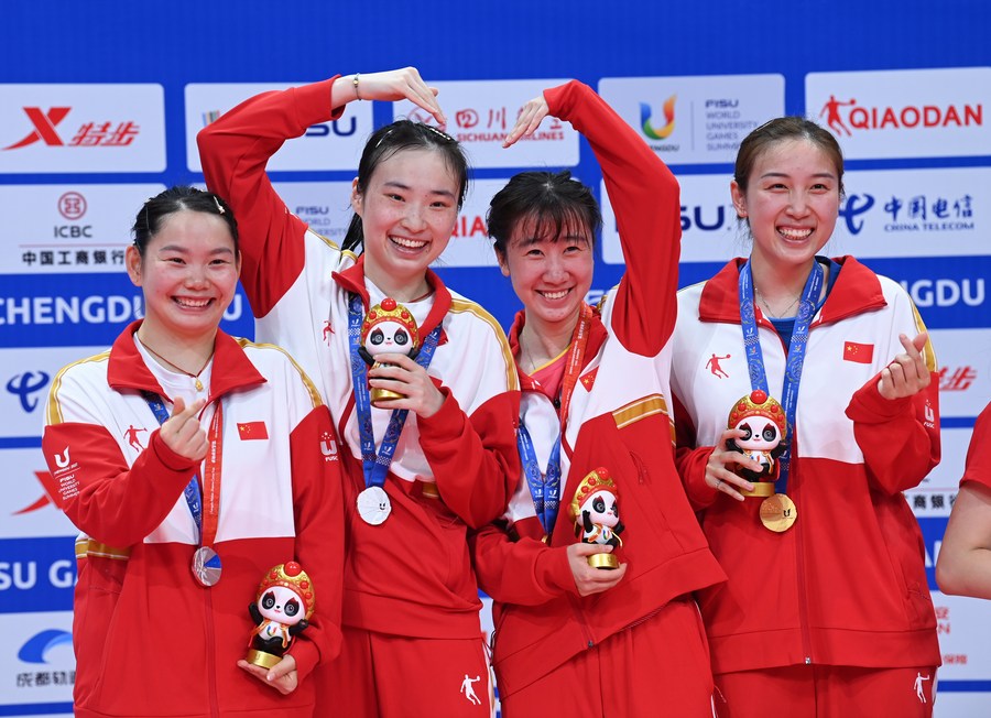 China's gold medalists Qian Tianyi(1st R)/Zhao Shang(2nd R) and silver medalists He Zhuojia (1st L)/Wang Xiaotong pose for a photo during the awarding ceremony of women's table tennis doubles at the Chengdu Universiade, August 4, 2023. (Xinhua/Zhang Bowen)