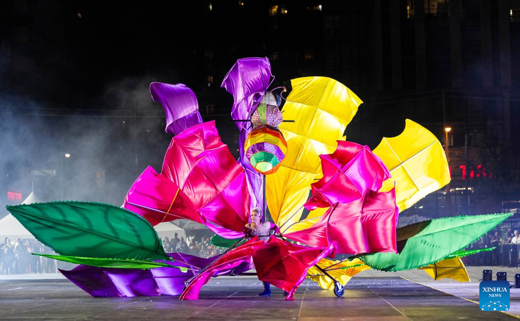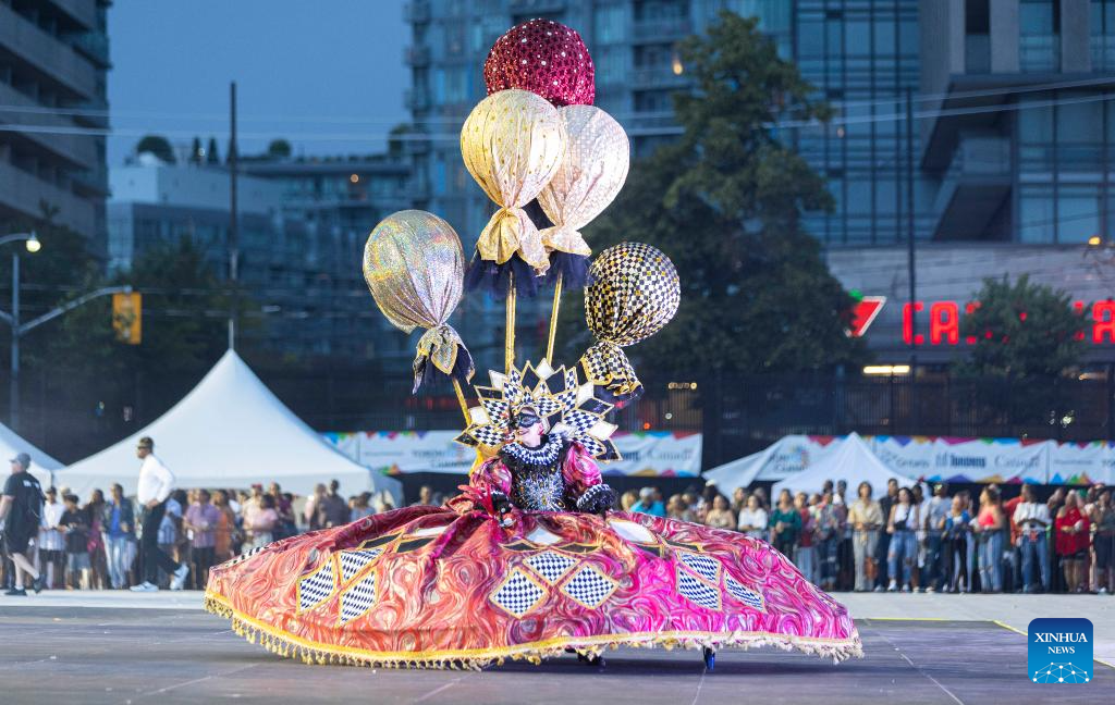 A dressed-up competitor performs during the King & Queen Showcase of the 2023 Toronto Caribbean Carnival in Toronto, Canada, on Aug. 3, 2023. Featuring over 50 large elaborate costumes on different themes, this annual event kicked off here on Thursday. (Photo by Zou Zheng/Xinhua)