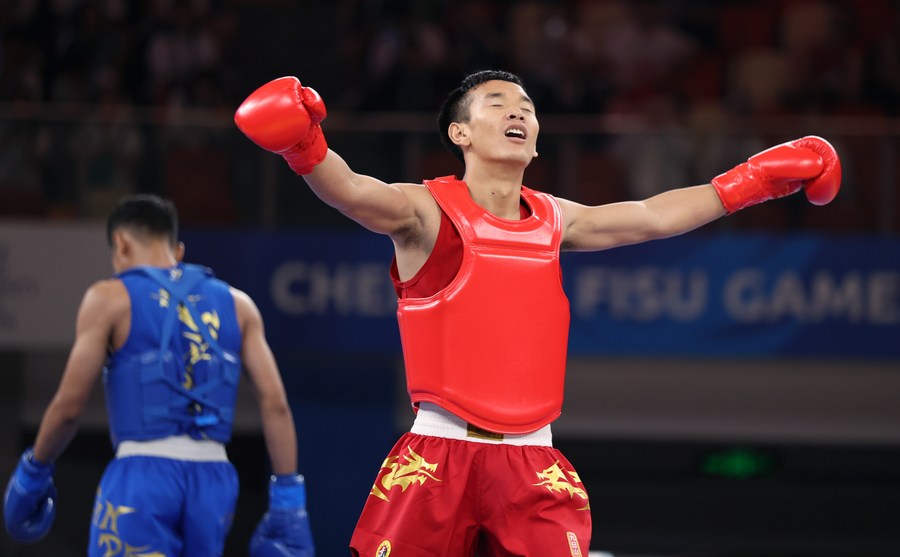 CHENGDU, August 4 (Xinhua) -- After two rounds of kicking and striking, Ma Yigu from China won gold by beating Indonesian Nada Guitara 2-0 in the men's Sanda 60kg final of the Wushu tournament at the Chengdu Universiade on Thursday.