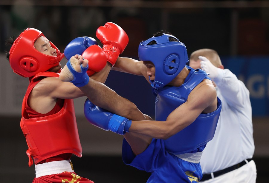 Ma Yigu (R) reacts after beating Bintang Reindra Nada Guitara of Indonesia in the Wushu men's 60kg final at the Chengdu Universiade, southwest China's Sichuan Province on Aug. 3, 2023. (Xinhua/Jia Haocheng)