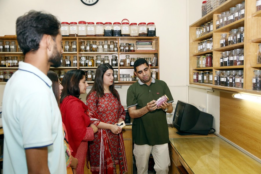 Students of plant sciences check samples of dried Traditional Chinese Medicine (TCM) plants at Quaid-i-Azam University in Islamabad, Pakistan, on May 18, 2023. (Xinhua/Ahmad Kamal)