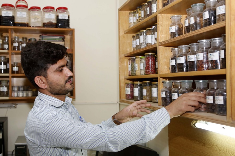 A student of plant sciences checks samples of dried Traditional Chinese Medicine (TCM) plants at Quaid-i-Azam University in Islamabad, Pakistan, on May 18, 2023. (Xinhua/Ahmad Kamal)